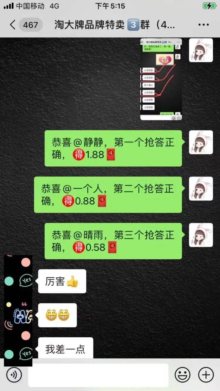 2、题目每一个结束后,一定要截图。把回答正确的群员昵称要在后面打勾,然后截图发群里,再艾特每个获得红包的人,祝贺她们,明确说明获得多少钱的奖励(等红包游戏结束后和大家私信)