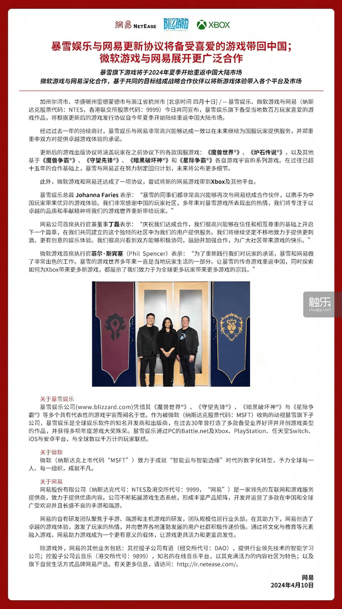 也许对于暴雪、微软、网易和玩家这几方来说,这就是最好的结果了。未来,微软是否会推动暴雪旗下IP再创辉煌,网易是否能在新的合作中再次大展拳脚,目前的声明中,给到了业内极大的想象空间。