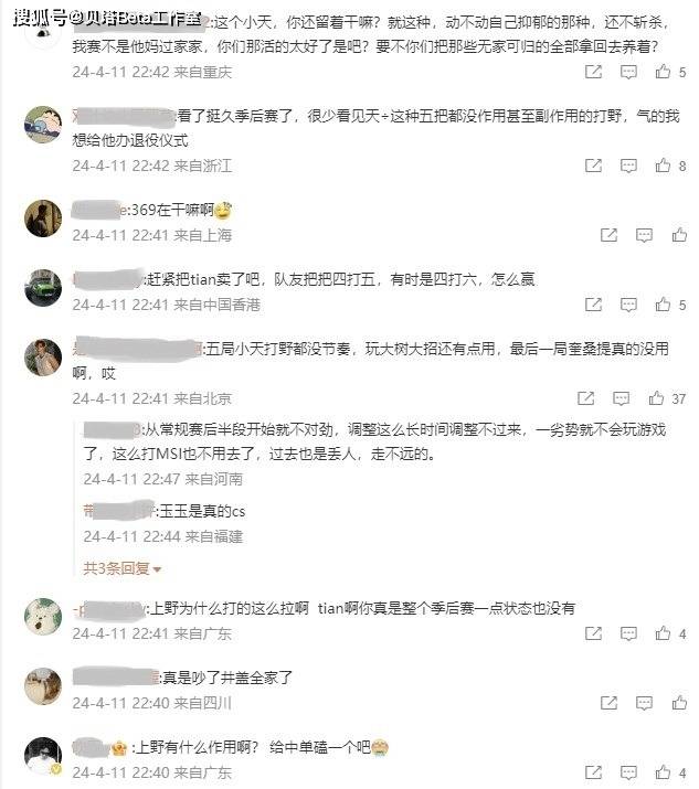 TES官博下方的评论如下,被骂得最惨的就是打野Tian,不少粉丝怒斥:5场都没作用甚至还是副作用的打野,在今年季后赛只有Tian能打得出来,队友把把四打五,有时候还是四打六,怎么赢?赶紧把Tian卖掉吧!也有粉丝批评369:被Bin压制,太菜了,最后一局奎桑提更是毫无用处!还有粉丝怒喷教练的BP,认为BP导致了比赛的胜负。