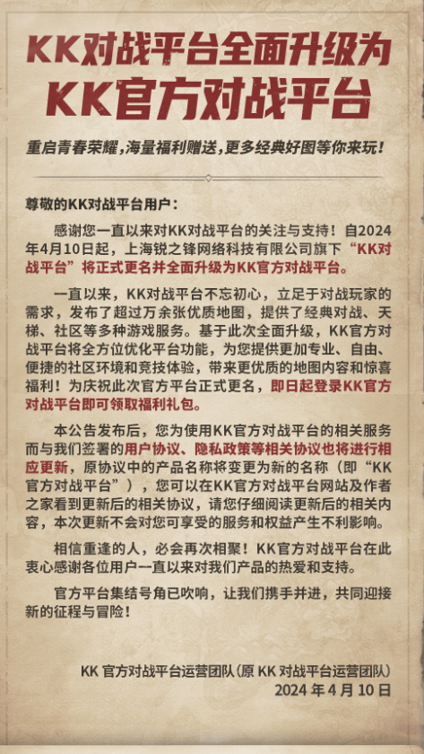 北京时间4月10日,暴雪和网易官方宣布重启合作。而就在双方官宣后不久,KK对战平台官方发布公告称,自2024年4月10日起,上海锐之锋网络科技有限公司旗下“KK对战平台”将正式更名并全面升级为KK官方对战平台。