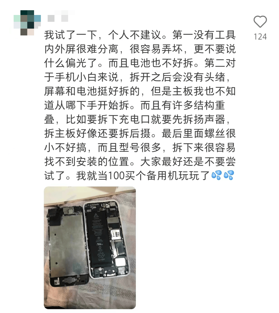 除了直接兜售“饭卡爆改手机”外,在社交平台上,还有不少“爆改饭卡手机”的攻略。在视频中,博主介绍,花几十元买一部苹果5S,拆下屏幕后,通过加热的方式分离内外屏,再把内屏上的偏光层取下,然后取下4个零件,并将其放入饭卡卡套后就完成了。而先前取下的偏光层还可以用于制作偏光眼镜。