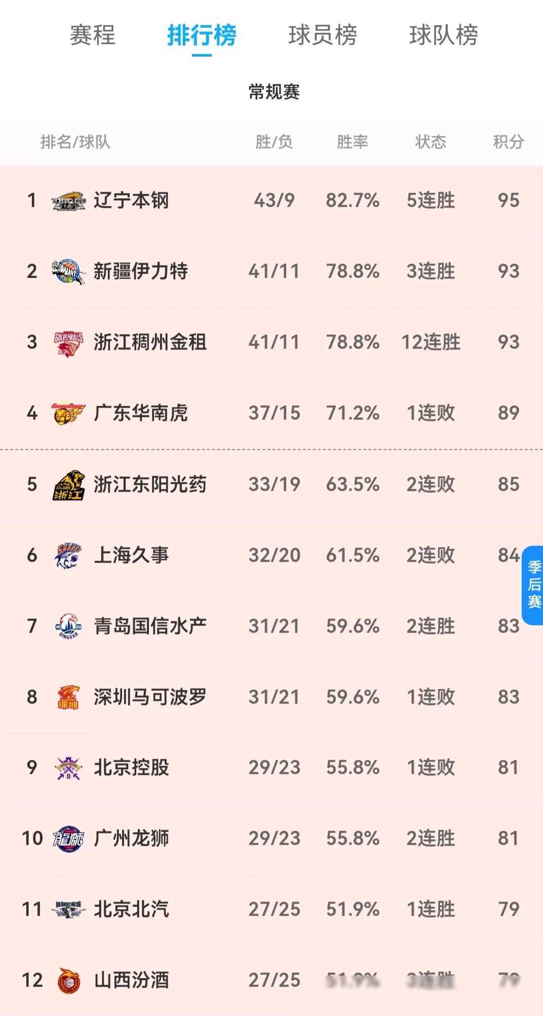 山西队的胜利让他们成功保持了11名的位置,而北汽队也没有失利,因此第11名的争夺并没有发生意外。与此同时,稠州队和新疆队都取得了胜利,第2名的争夺也没有发生变化。然而,唯一让人稍感意外的是,天津队竟然以113:112的比分意外击败了广东队,尽管这场比赛对季后赛的对阵没有任何影响。