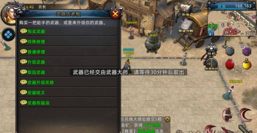 准备好了材料后,选中材料并点击确定,这时你会发现你手中的武器消失了。别着急,此时需要等待30分钟后,你就可以取回武器了。当然,如果你着急使用武器,也可以使用金币直接取回。在游戏中,花钱加速事情的办理也算是一种特色体验。