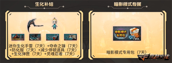 而在4月16日至5月12日期间,CFer每周进入活动页面还可以无条件领取专属补给礼包,助力CFer畅游全新版本内容。包括生化补给与暗影模式专属补给礼包均可无条件领取1次,最多可领取3次。