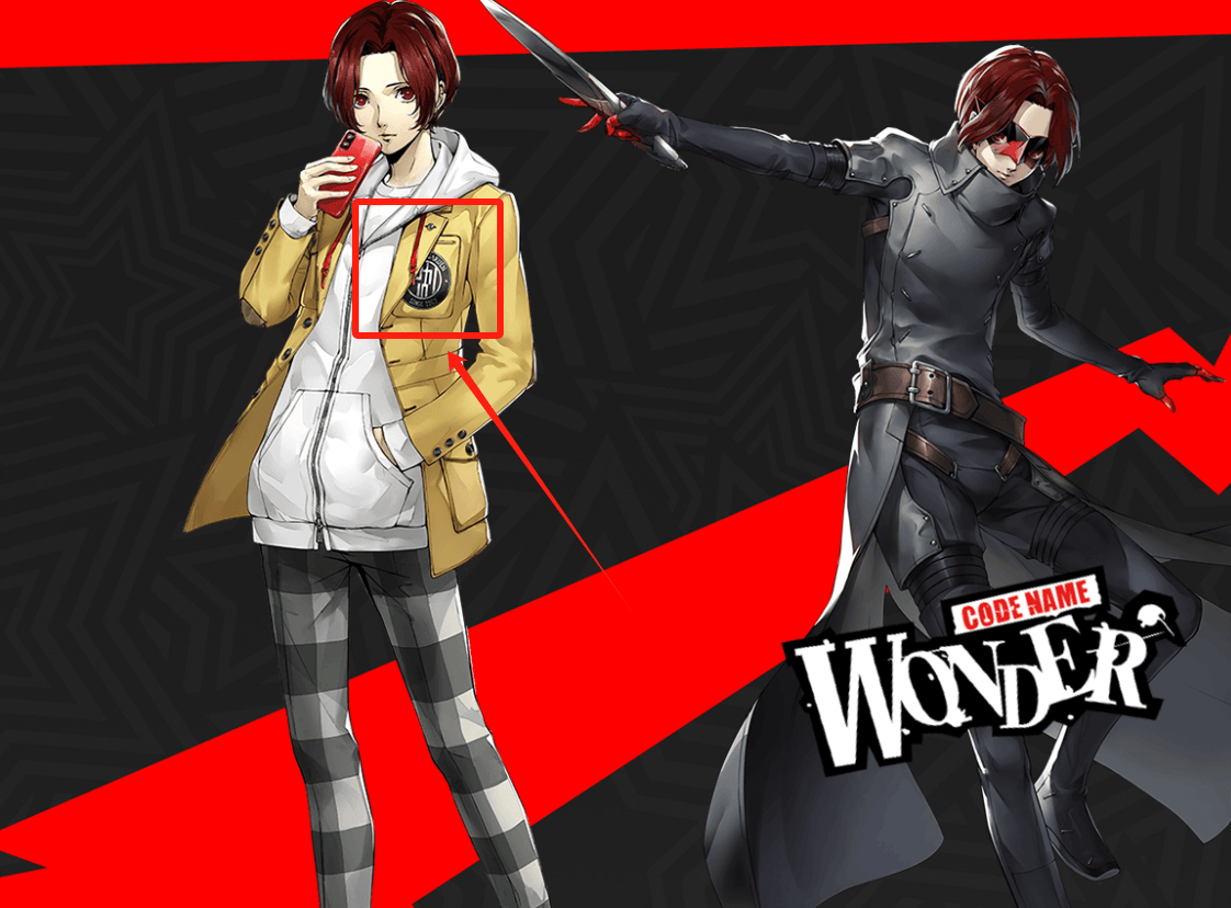 在主人公黄白色系的日常制服设计上,有猎装的影子。确实,副岛成记(P5主画师)也表示当初设计wonder的时候,参考了猎装风格;其次,主人公的制服还有个小细节,校园制服上的标志,竟是汉字造型,这也太用心了吧!