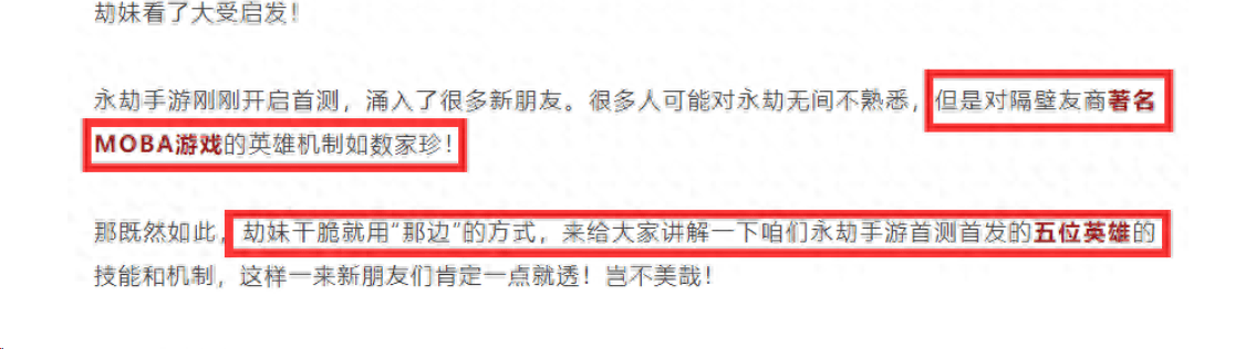 不仅如此,在此之前官方还蹭用“隔壁友商著名MOBA游戏”的方式,讲解首测首发的五位英雄技能和机制,在介绍到胡桃时,更是直说“挂在头上谁不会,胡桃还能给你加血呢”。