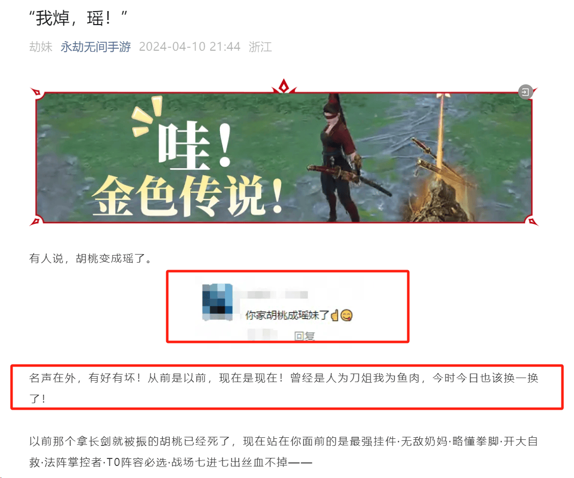 这还没完,《永劫无间》的官方似乎并不想就此低调处理。相反,他们似乎打算把这个事情当做一次营销机会,公然在公众号标题中提及瑶,还在文章中表示:“从前是以前,现在是现在!曾经是人为刀俎我为鱼肉,今时今日也该换一换了!”给人的感觉是,不但不觉得争议,反而还有点小自豪。仿佛在说:瑶妹,你的流量,我要了!