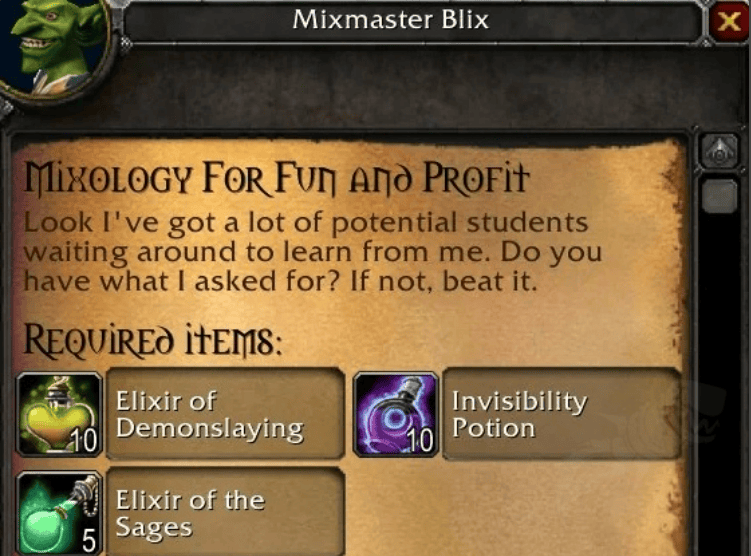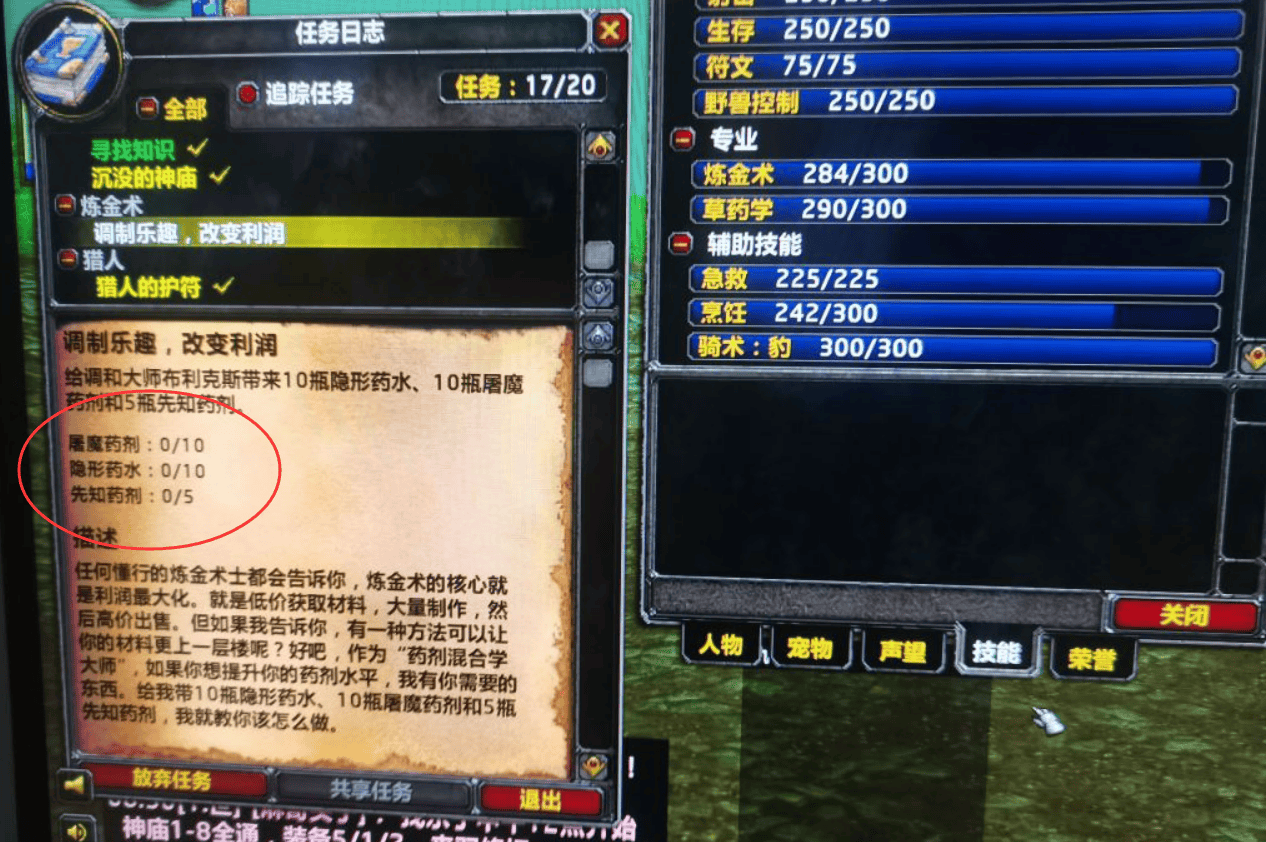 旧版的调制任务需要特效10个巨魔之血药水+10个隐形药水+5个先知药剂。但此任务有Bug,因为特效巨魔之血药水的图纸要到祖尔格拉布才开,现在做不了。热修之后,10个特效巨魔之血药水被换成了10个屠魔药剂。