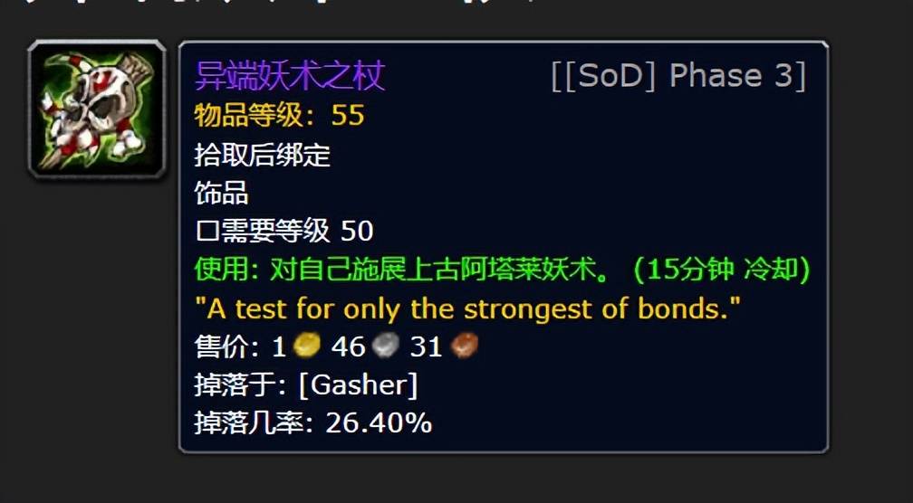 除“风蛇颅骨”外,P3还带来其他一些有趣的玩具,包括阿塔拉利恩的魔化巨岩、异端妖术之杖、巫医的妖术之杖,紫装品质,值得收藏。