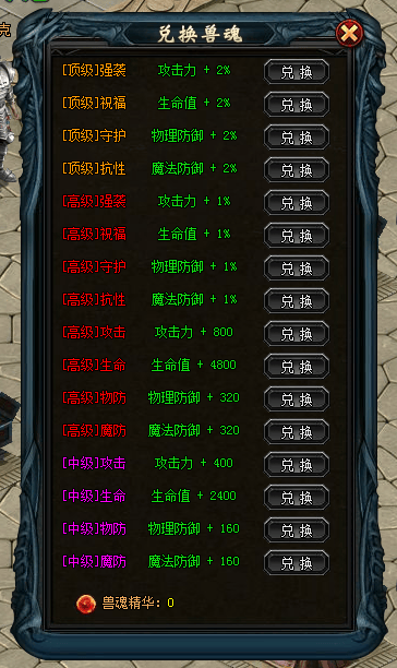3、 兑换兽魂:品质越高兽魂,兑换需要的兽魂精华数量越多。