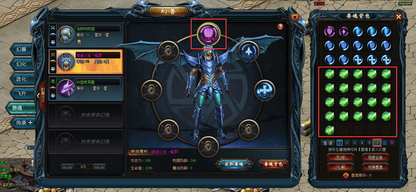 兽魂升级:吞噬兽魂可升级兽魂;兽魂等级越高,获得的属性加成越高;