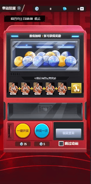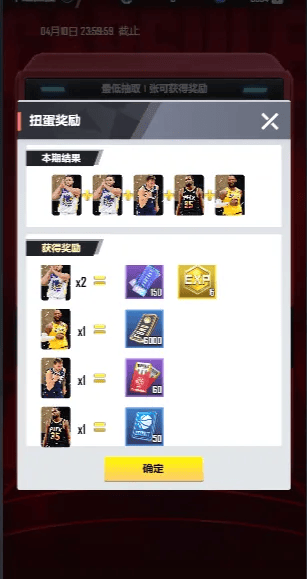 扭蛋中共有6种卡牌人物,分别为约基奇、东契奇、杜兰特、詹姆斯、字母哥以及库里。根据牌型组合即可获得对应的可领取的最高奖励,您可以选择直接领奖重来,也可选择累计奖励,至多累计5张卡牌。