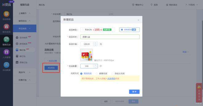 奖品分为实物奖品和现金红包(单个红包最低金额为1元),每轮游戏中可添加多种奖品