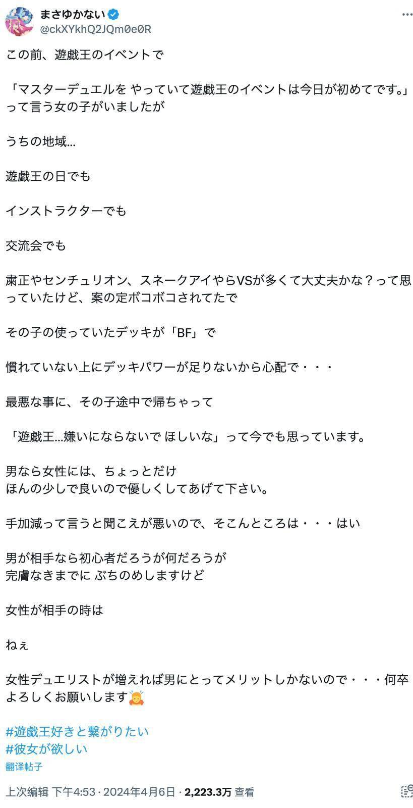 近日,日本一位《游戏王》卡牌玩家在推特上分享了他参加某场比赛的经历。该玩家表示在比赛过程中遇到一位女性新手玩家,她告诉我:“这是我第一次参加游戏王活动,我担心我的卡组不够强大”。糟糕的是,这位女性新手玩家在中途离场了。