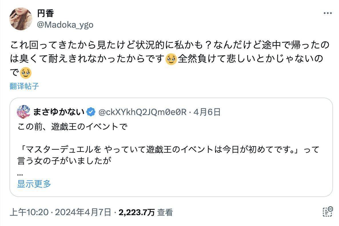 该推文在日本社交媒体上疯传,最终被故事里提到的那位女性玩家看到。然而女孩透露称,她中途离场不是因为输了而难过离开,而是因为现场气味太臭了。