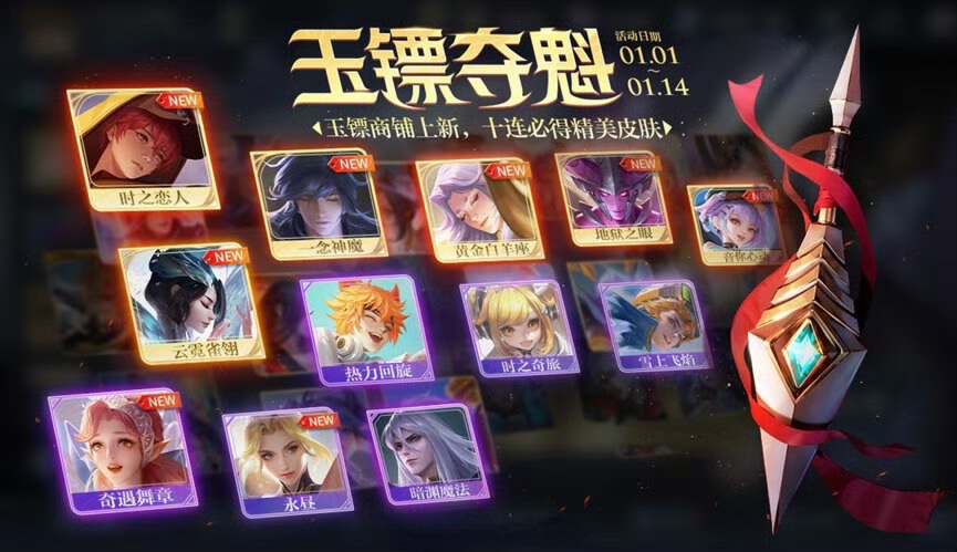 另外,元旦期间除了上架几款皮肤之外,玉镖夺魁也进行了再一次的返场,这个活动大家基本上也都了解了,十连抽可以必得精美皮肤。值得一提的就是此次玉镖夺魁活动新增了李信的一念神魔、夏洛特的永昼、艾琳的奇遇遇章等等皮肤,这次的奖池,玩家有喜欢的皮肤,也都是可以去参与的。