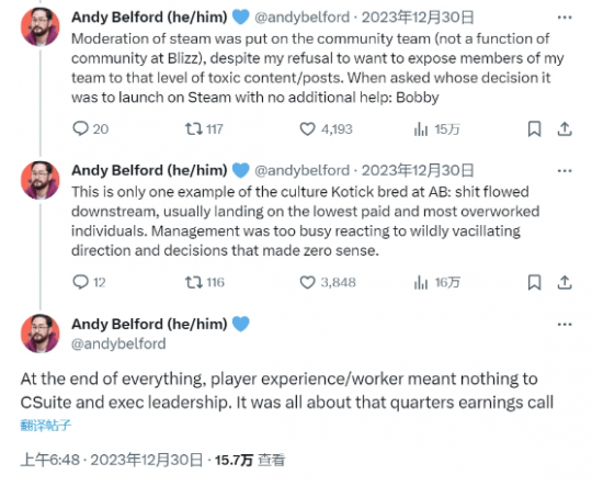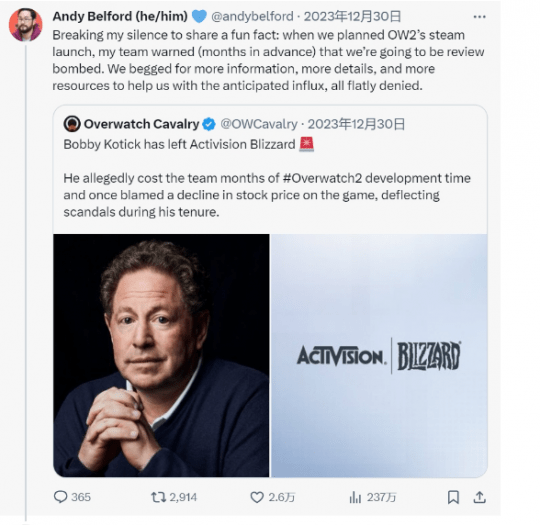 2023年12月30日(上周五),为暴雪掌舵32年的考迪克正式离职。而今在暴雪的官网,你已经看不到关于考迪克的个人信息介绍了。至于此次对考迪克发难的人,则是暴雪的资深社群发展经理Andy Belford。他对当时的情况,进行了具体的描述。