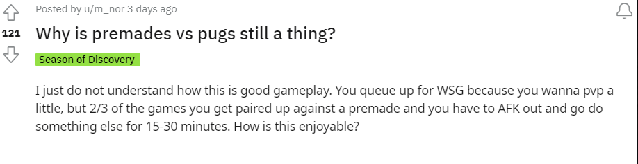在Reddit论坛,玩家m_nor再次抱怨了散人战场体验问题。他说自己只想在下班后享受一点PVP娱乐,但单排有2/3的时间会遇到多排的国家队。国家队有统一的语音指挥,有优化的职业搭配,通常还有更好的装备,野队碰到它们几乎没有胜算,导致散人毫无游戏体验。m_nor只想在晚餐前快速玩几局,但每次排到国家队,他不得不AFK出去,然后再等15-30分钟。作为一款竞技游戏,魔兽并没有任何公平可言。