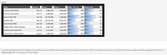 据Eurogamer报道,近日,索尼演示文稿中的一张图表透露了其部分第一方游戏发售前两年的销量,包括《漫威蜘蛛侠》《地平线:零之曙光》《战神》等。