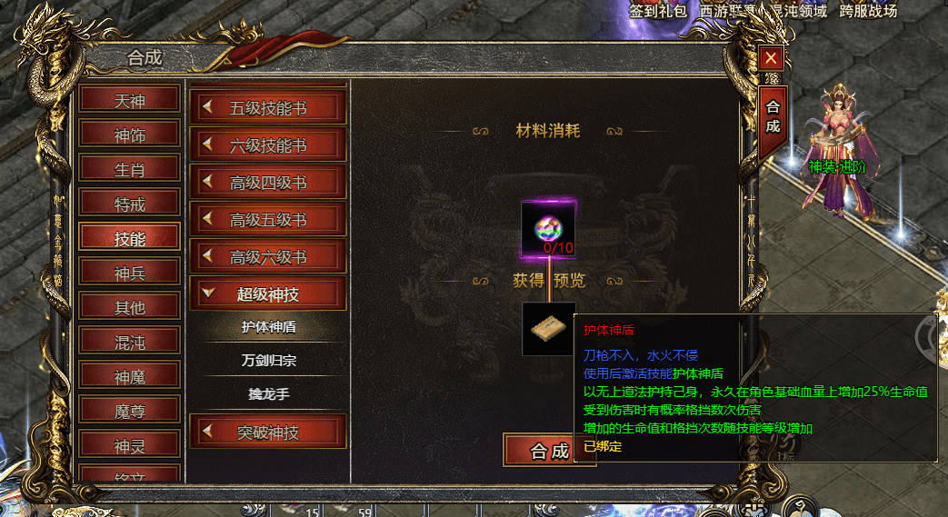 技能书合成: 收集到10个【至尊宝石】后,在合成系统的技能合成界面寻找超级神技类技能,即可找到护体神盾的合成界面。在这里,将材料合成为护体神盾的技能书。