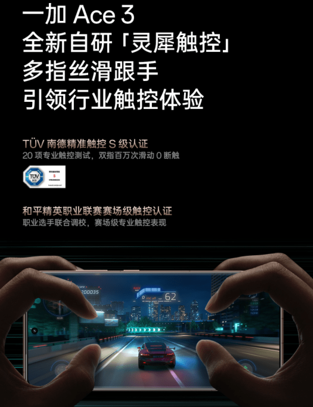 在S级考题中还有一个重要的难题,一直是安卓手机的短板,那就是触控响应。一加基于和和平精英、原神等知名手游长期的合作,对于这个难题也交出了出色的答卷。一加Ace 3支持全新灵犀触控技术,通过TÜV 南德精准触控 S 级认证、和平精英职业联赛赛场级触控认证的精准和灵敏性,相信也会在玩家上手后带来惊喜。
