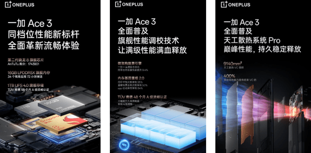 一加Ace 3搭载的是骁龙8 Gen2旗舰芯片,实测跑分可以超过174万,这个成绩相比某些骁龙8 Gen3机型甚至都不逊色。同时,一加Ace 3最高支持16GB+1TB的超大存储,搭配微架构超算引擎和旗舰级的天工散热系统Pro,能够实现34个应用72小时的持久保活,并且久用4年不卡。