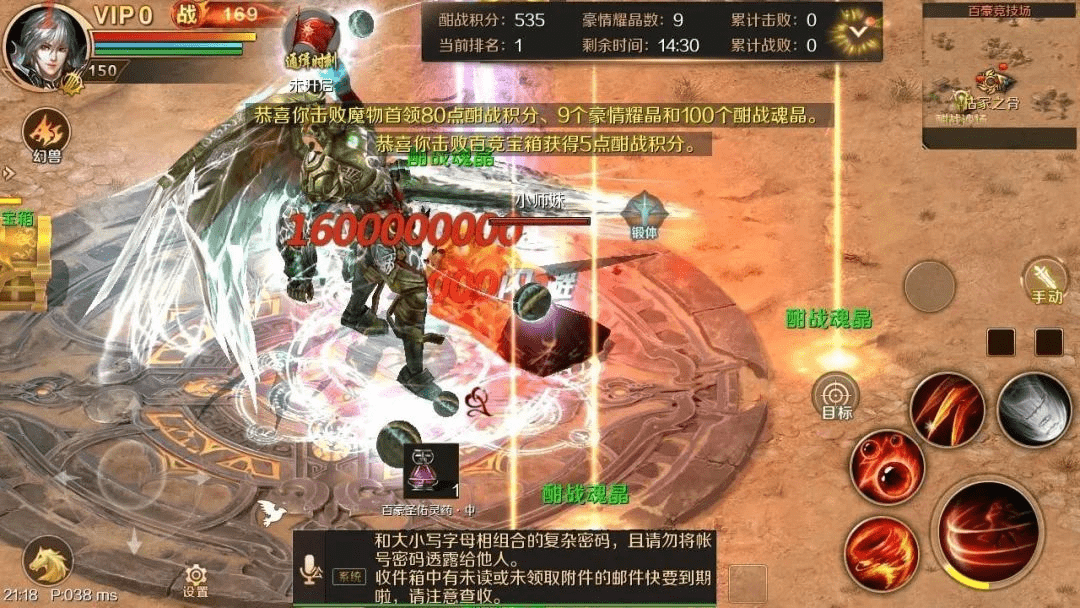 为了增加竞技的紧张感,官方新增了“缩圈”设定“前进之路”。在竞技场内,击败其他对手能夺取对方的酣战积分。当基础酣战积分低于300时,通过刷小怪有机会获得额外积分,进而提升排名。若能击败场内的魔物首领,造成最后一击的神选者将获得高达80分的酣战积分。另外,开启竞技场内的百竞宝箱也有机会获得额外的积分。每持有1份豪情耀晶,结算时还能额外获得50点积分。