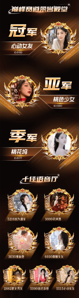 @因为遇见、@花间酒、@魔仙堡、@微醺女友、@欲见男友、@语过添情、@心动女友摘得巅峰十佳语音厅的称号!让我们恭喜她们,并预祝未来的直播道路越来越红火!