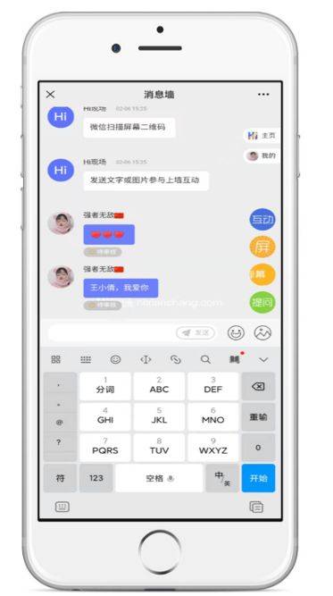 弹幕即消息上墙的另外一种展现形式,参与者发送消息后,大屏幕飘动弹幕信息