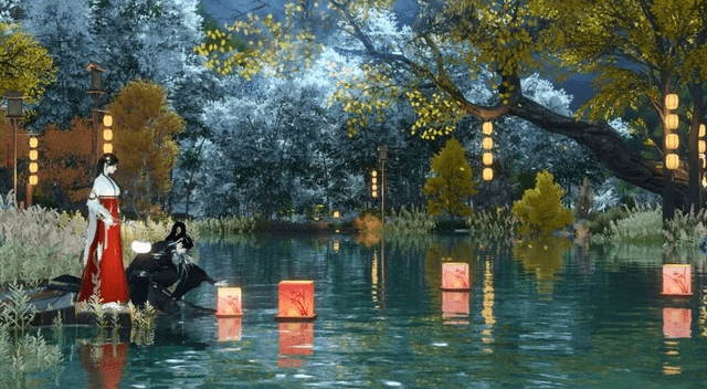 两人心有灵犀,一起踏歌江湖,共同度过美好的江湖时光。于湖边放纸灯,看着灯火在水中摇曳,并许下美好的愿望~