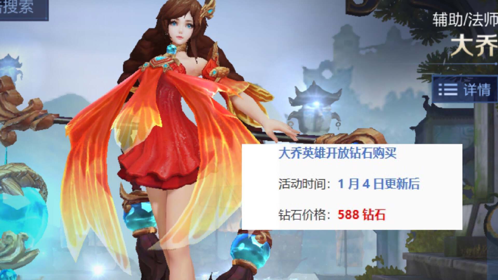 最后就是关于大乔这个英雄的具体详情了,之前要获得大乔这位英雄,只能选择点券或者金币购买,但是在S34赛季开服之后,大乔这位英雄,可以用588钻石兑换了,对于新手玩家来说,也是一个不错的消息。因为一般来说很多活动都会赠送钻石,很多玩家的钻石都是不知道怎么花的。