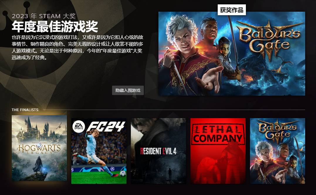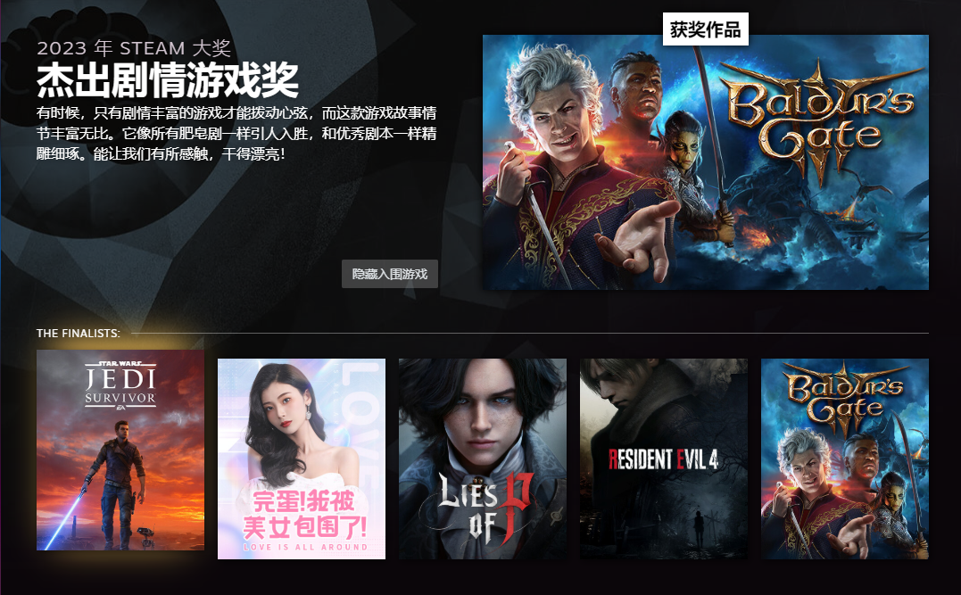 Steam今天公布了2023年的Steam大奖获奖名单,《博德之门3》毫不意外地获得了年度最佳游戏,顺便还薅走一个杰出剧情游戏奖。