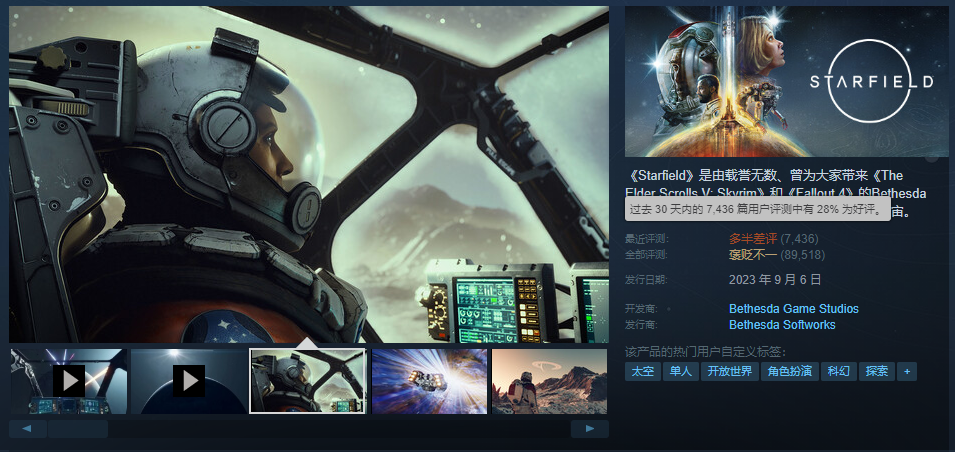 由于《星空》与其他B社游戏的质量差距巨大,大部分玩家对《星空》的表现表示很失望,《星空》在Steam上最近的评测已经由之前的“褒贬不一”变成现在的“多半差评”了,好评率仅为28%。