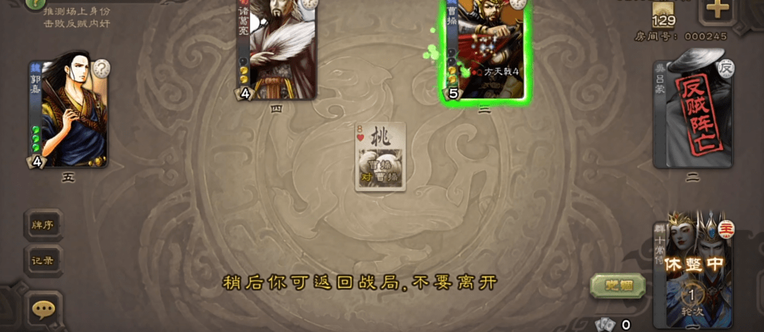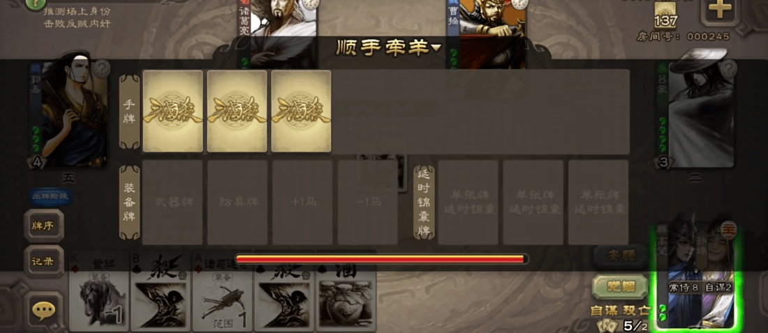 这个时候搭配窥机就可以稳定下掉对方手里的【闪】,从而提高自己的输出成功率,作为地主的话第一回合十分好用。