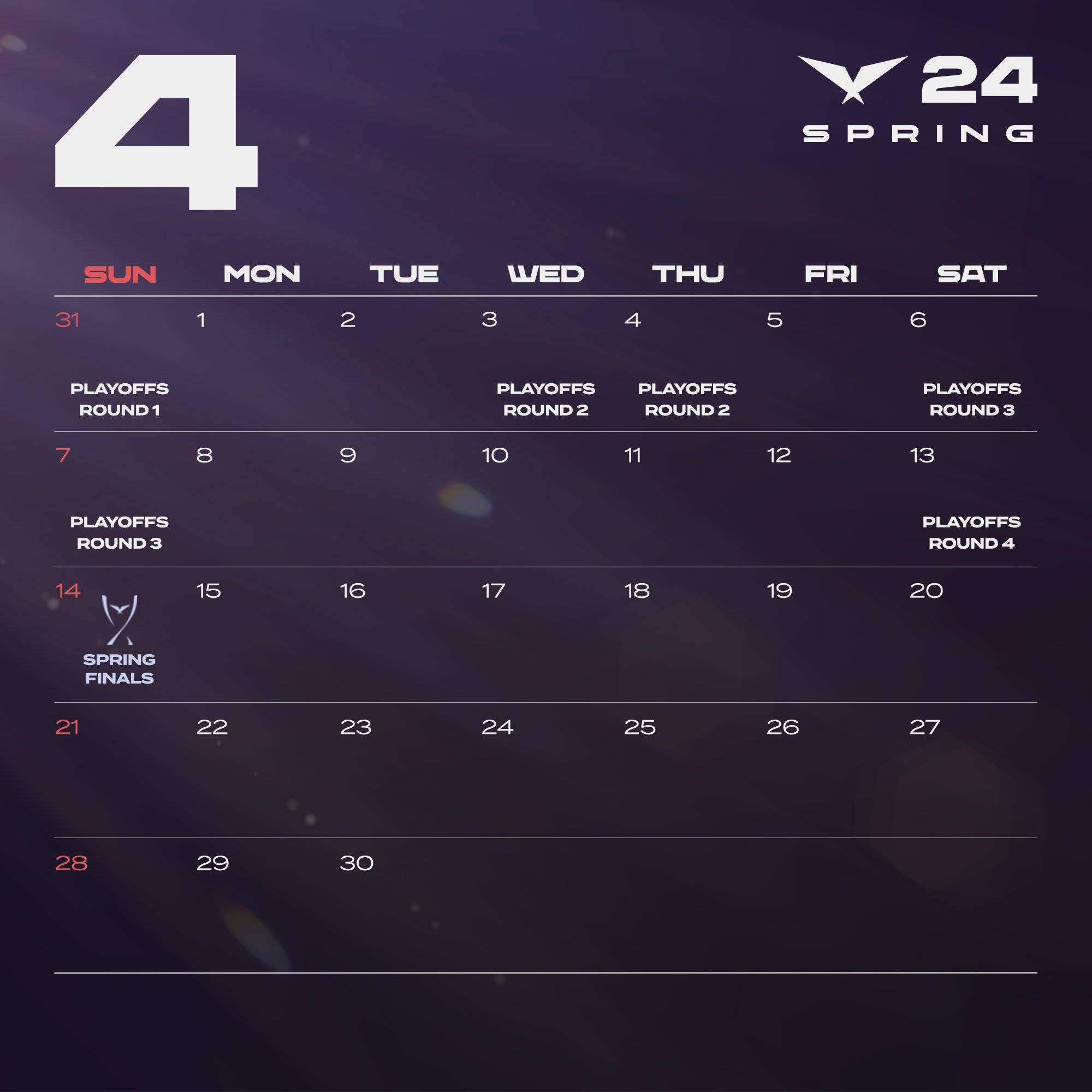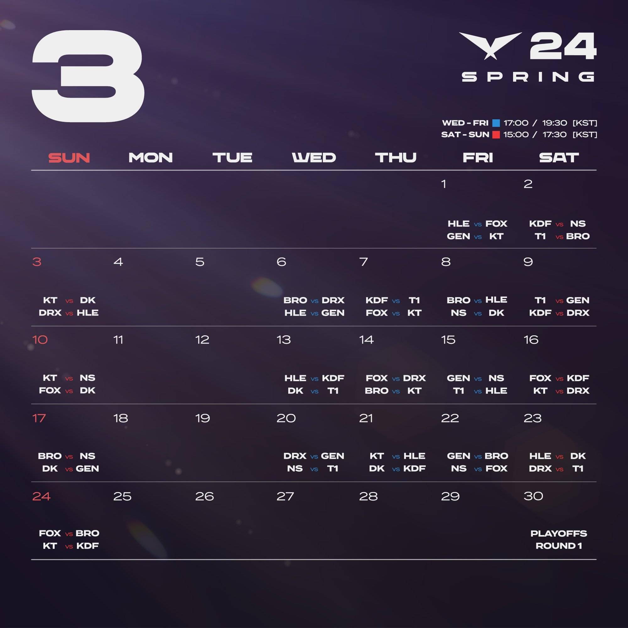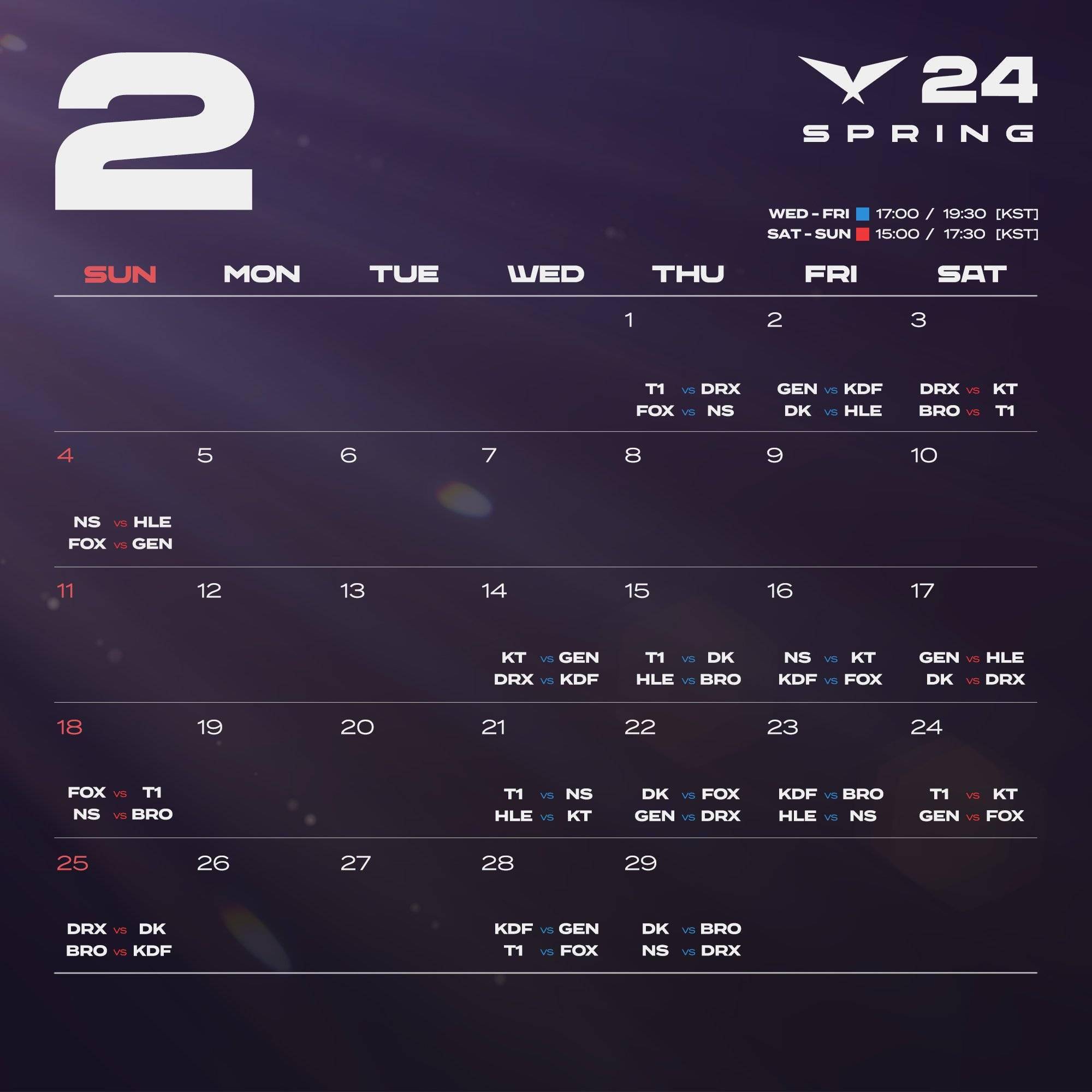 LCK春季赛常规赛每周三至周日,每天两场比赛。LCK春季赛季后赛将于3月30日开始,决赛在4月14日举办。