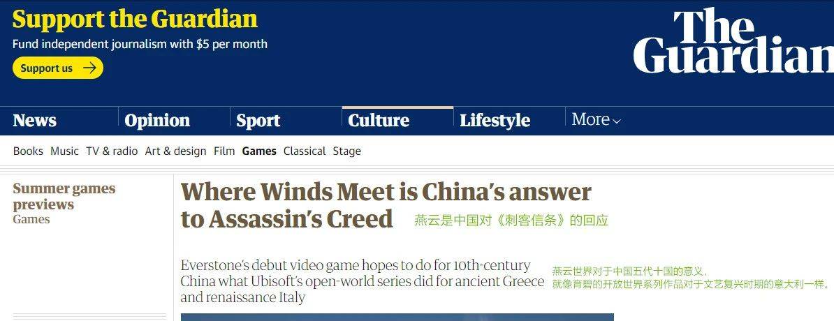 其中,英国主流媒体The Guardian 表示:“燕云对于中国五代十国的意义,就像育碧的开放世界系列作品对于文艺复兴时期的意大利一样。”