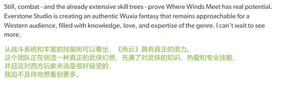 从欧洲游戏资讯平台Eurogamer发布的文章里,我们更是能清楚地看到外国友人对《燕云十六声》毫不掩饰的期待。文章里写道:“从战斗系统和丰富的技能树可以看出,《燕云》具有真正的潜力。这个团队正在创造一种真正的武侠幻想,充满了对武侠的知识、热爱和专业技能,并且这对西方玩家来说是很好接受的,我迫不及待地想看到更多。”