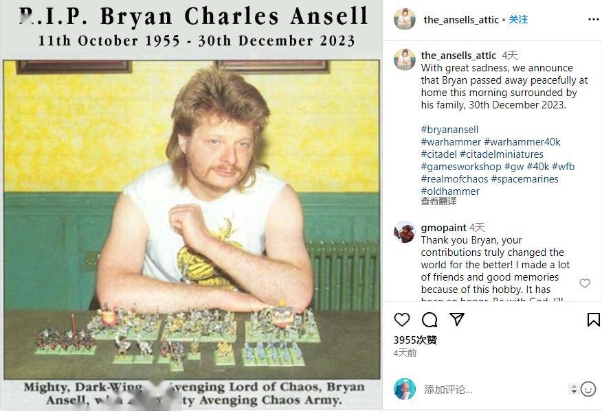 Games Workshop早期领导人物Bryan Ansell的妻子在今天通过社交账号宣布了他去世的消息。
