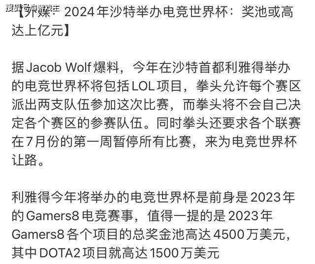 关注比赛的玩家应该能够感觉到,这两年世界赛的奖金变得越来越少了,这应该也和拳头的运营有一定的关系,就连拿到世界赛冠军的选手都没有太好的收入,更别提其他的职业选手了。为了改变这一现状,沙特宣布了一个令所有玩家都非常意外的事情,他们将会举办电竞世界杯,这一次的对抗也包括英雄联盟的项目,拳头允许每个赛区派出两支战队参加这一次的比赛,同时,拳头官方还要求各个联赛在七月份的第一周暂停,所有的比赛为电竞世界杯让路。
