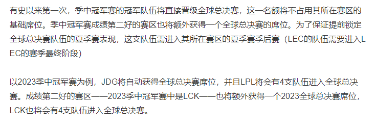 除了举办地之外,官方还公布了一个重磅消息:MSI冠军直通世界赛,不过还有一个限制条件,那就是:夏季赛必须进入季后赛,如果是LEC赛区的队伍需要进入冬季赛,拿到MSI冠军就能获得S赛名额,对于所有队伍来说,这都是很有诱惑力的,能够夺冠基本上就稳了。