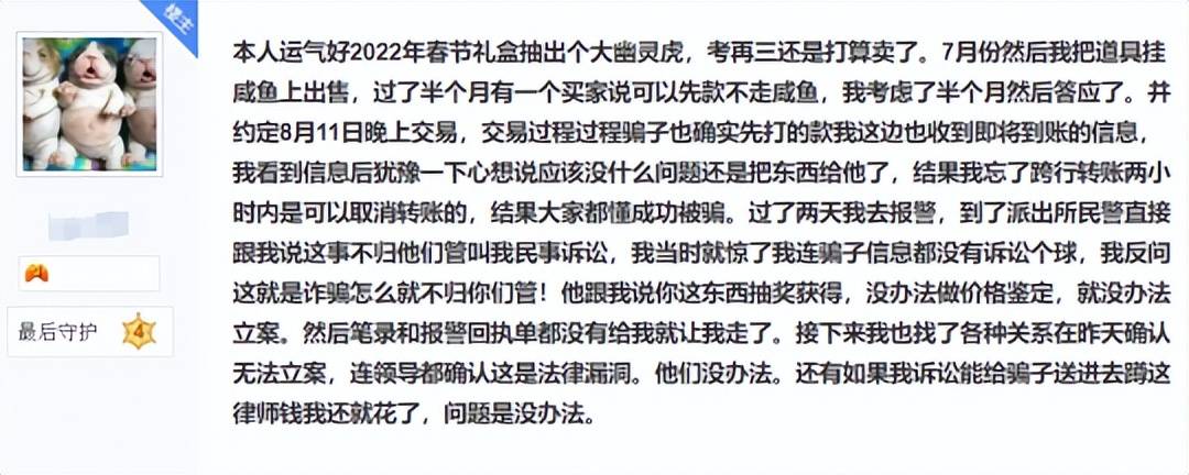 根据楼主过往帖子的自述来看,他是在2022年抽礼盒抽出了大幽灵虎,并以11500元的价格卖给了骗子。结果被骗子钻了个跨行转账可以取消的空子,把幽灵虎交付了却没拿到钱,于是就开始了长达两年的维权之路。