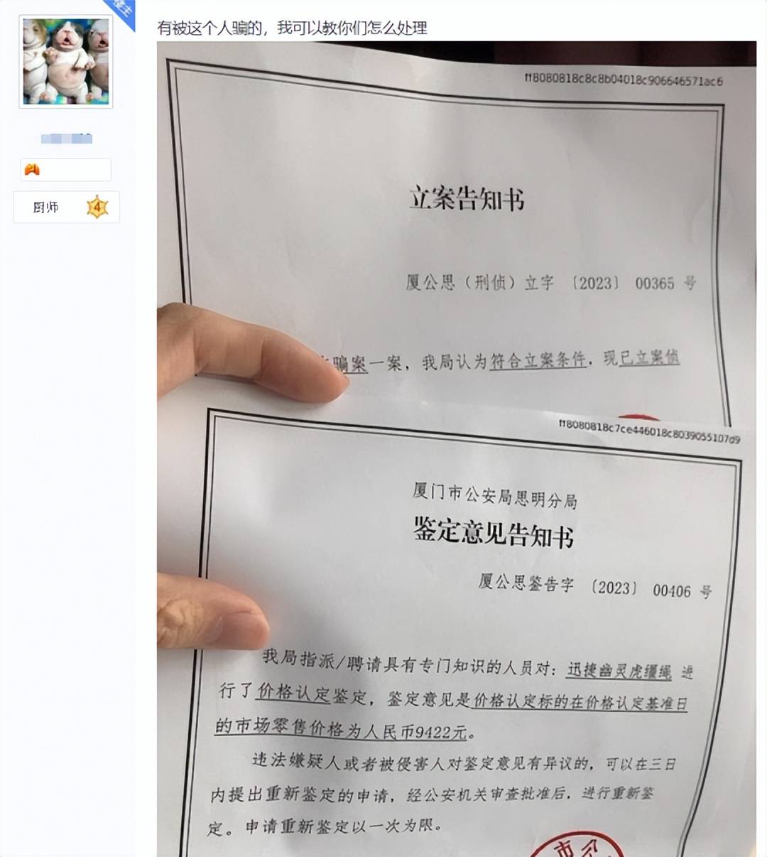 因为幽灵虎是抽奖所得的游戏道具,它的价格不好鉴定,所以楼主一开始也没办法立案。后续通过两年的不懈努力,他终于通过司法程序对2022年春节时期的幽灵虎价格进行了鉴定,市场零售价为9422元,也成功将骗子这个行为定义为诈骗,向这个人发起了全国通缉。