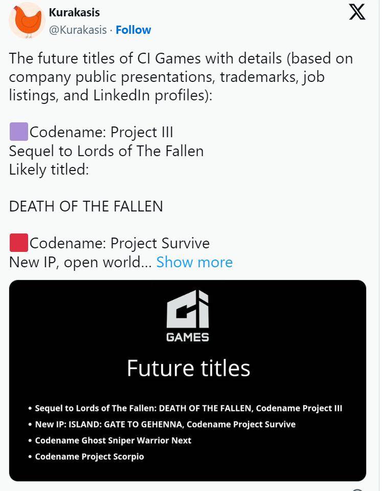 推特主Kurakasis表示CI Games于1月3日注册商标“Death of the Fallen”。无论新作是续作还是新IP,据CI Games在2023年11月公开的会议内容表示,“Project 3”将利用《堕落之主》成功所获取的经验。该作还将构建更具雄心勃勃的游戏元素,以吸引更多的玩家加入。另外,“Project 3”也会使用虚幻5开发。