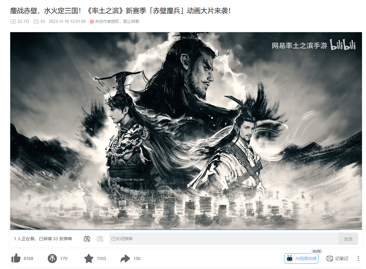 国潮、国风、国漫等等的成功都证明年轻人并非对传统文化不买账,反而很感兴趣。所以《率土之滨》新赛季赤壁鏖兵的主题宣传片将水墨画法与国漫风结合在一起,用非常创新的方式将赤壁之战跨越时间带回到所有玩家面前,吸引了众多年轻玩家。