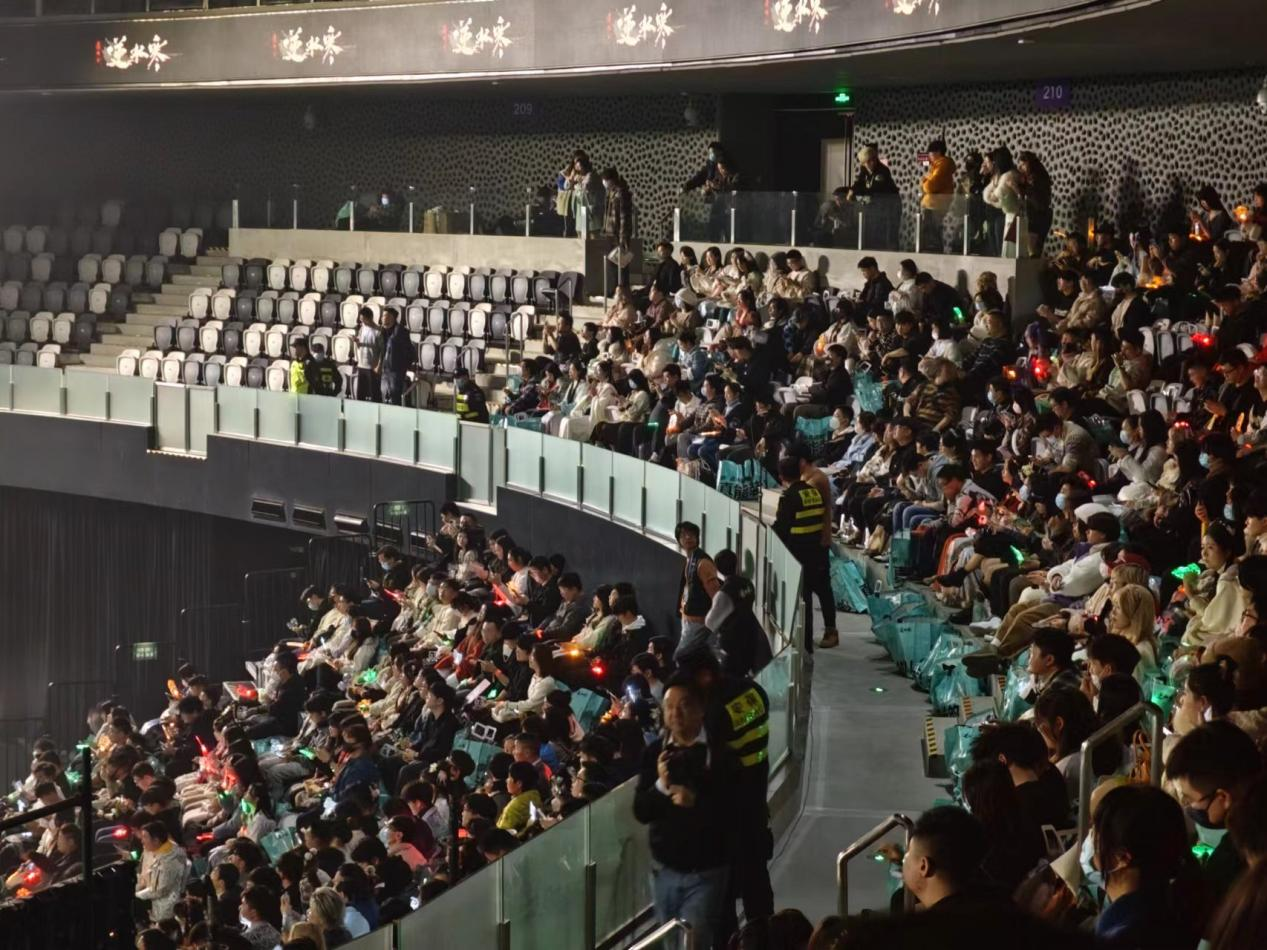 从观众席到舞台间是一块宽阔的拍摄区域,载有专业摄影机的巨大机械臂早已在此升起,工作人员正在对现场的录制设备做着紧张的最后调试,远处时不时会传来几声对讲机的交谈声。几位摄影师扛着他们的长枪大炮,不断在这片区域中来回奔走,试图捕捉观众席上更多充满期待的面孔。