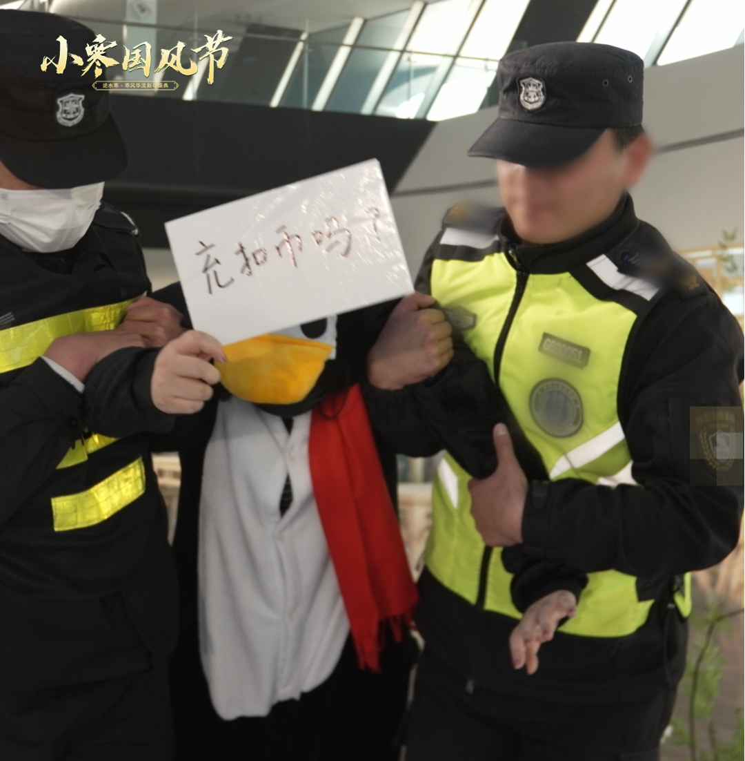 最离谱的,还要数下面这位混入人群中的鹅形“间谍”,当他拿出那张“充扣币吗?”的广告牌后,立马就遭到了现场保安大哥的“左右为男”。