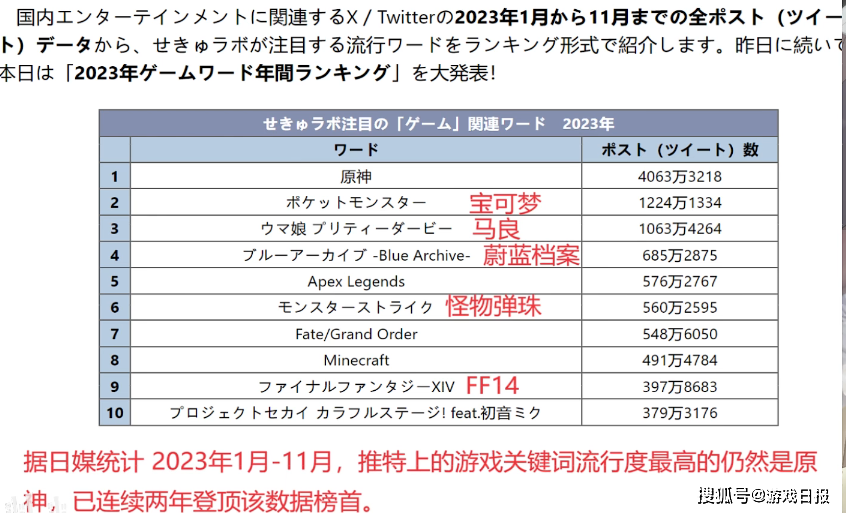 据日媒统计,在2023年1月-11月期间,推特上的游戏关键词流行度最高的仍然是原神,这已经是原神连续两年登顶该数据榜首。但这里有点小错误,因为这其实已经是原神连续三年拿下该数据的榜首位置,只不过在2021年的时候,推特并未公布具体推特条数才没被日媒算上。