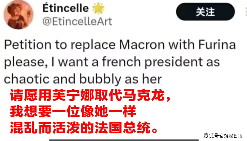 而在玩家们还沉浸在4.2主线剧情的感动之时,原神制作组又上线了芙宁娜的个人曲《轻链》,这首曲子有一次引爆了全球原神玩家,在推特上有大量玩家在称赞这首歌,尤其是法国玩家对于说法语的芙宁娜更是爱的不行,甚至有一些法国玩家发起了用芙宁娜取代马克龙的请愿。虽说大家都知道这都是闹着玩儿的,但这也间接说明了法国玩家对于芙宁娜的喜爱程度。毕竟,如果不是真爱,也不至于为一个虚拟角色请愿了。