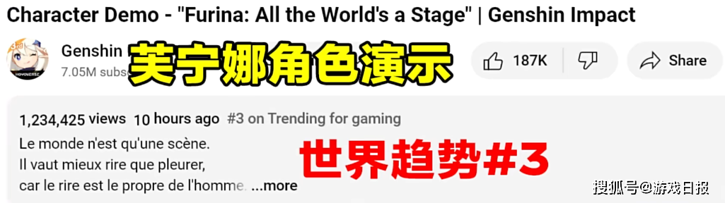 你以为4.0前瞻就是原神这一年的极限么?在4.2版本,官方上线水神“芙宁娜”的角色相关信息,这款游戏又在海外爆了。芙宁娜的角色演示在主线上线过后,在油管上冲到了世界趋势前三位置,推特上有关于芙宁娜的角色演示也都没有停止讨论。很多海外玩家都在心疼芙芙,为她独自表演500年的经历流泪。