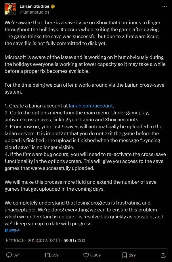 自《博德之门3》于 12 月初登陆 Xbox Series 主机一来,玩家一直在报告存档问题。拉瑞安和微软在确定问题原因时似乎遇到了很多困难。开发者在 12 月底发布了一条公告解释了情况。该问题是因为游戏有时会认为在存档实际上写入硬盘前保存过程已经完成。使用拉瑞安的跨平台存档服务可以解决该问题,但除此之外存在的问题持续了一个月没有解决。